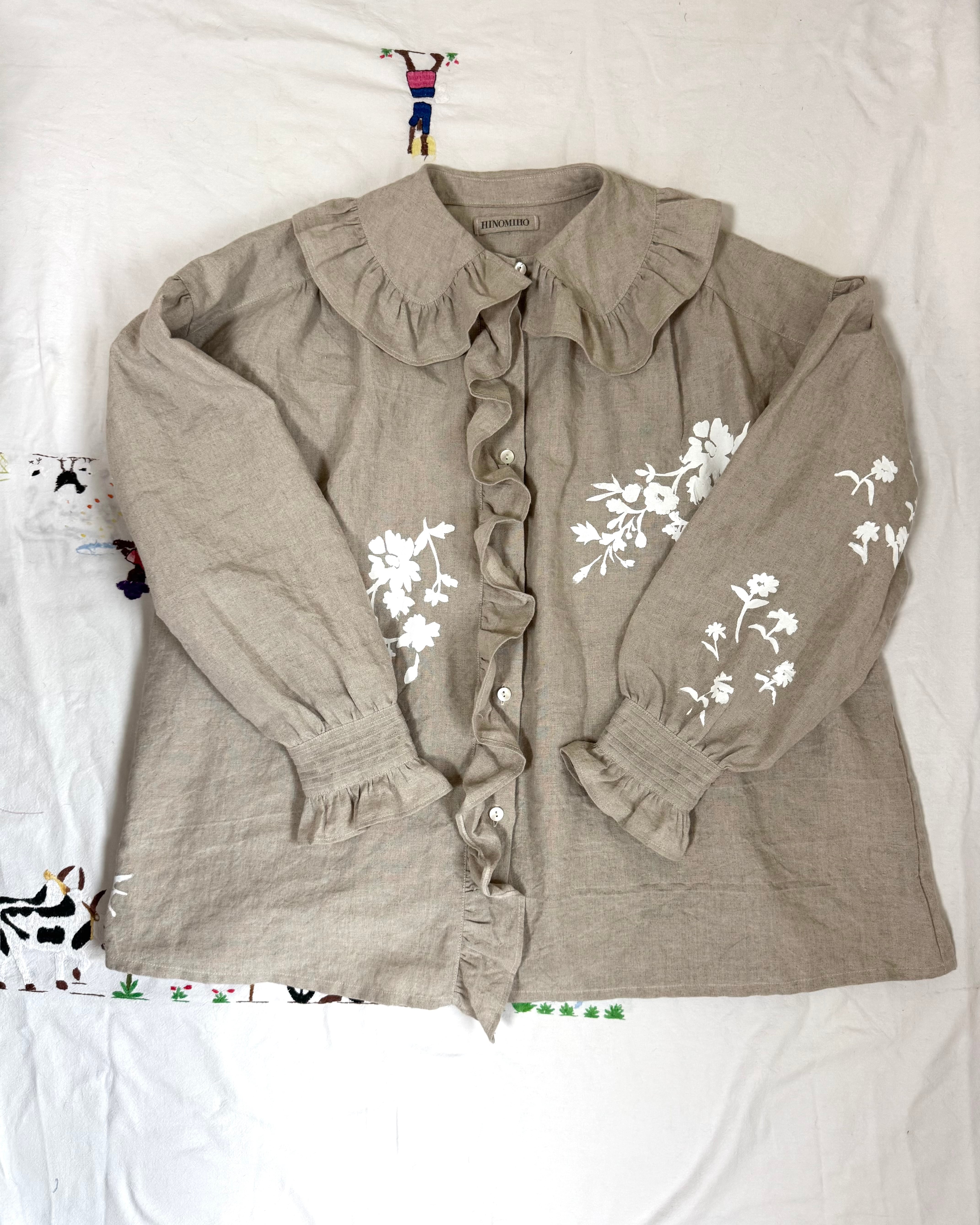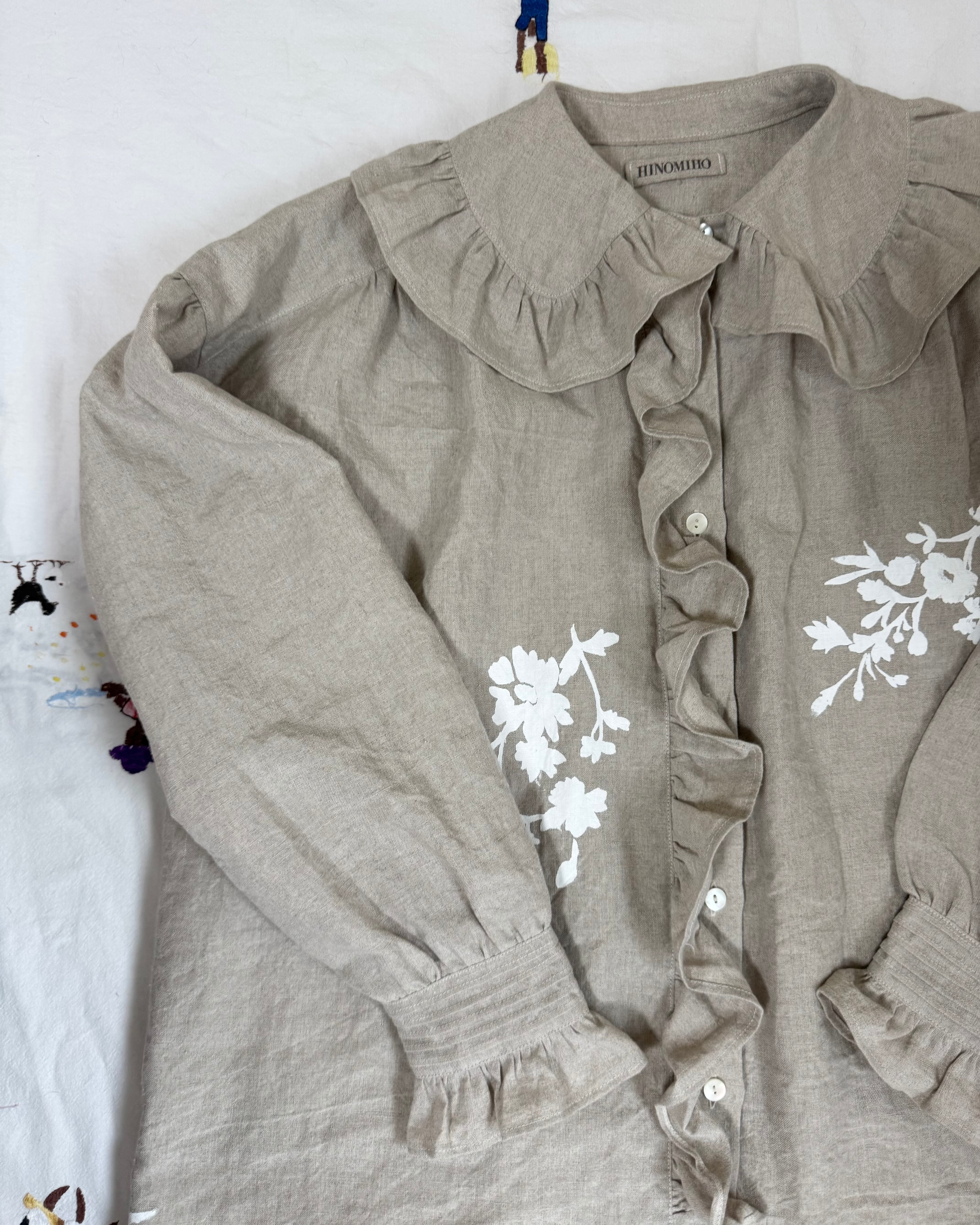 三重で紡績され、遠州産地にて作られた上質なリネンを使用したブラウスにオリジナルのシルクスクリーンプリントを施しました。
