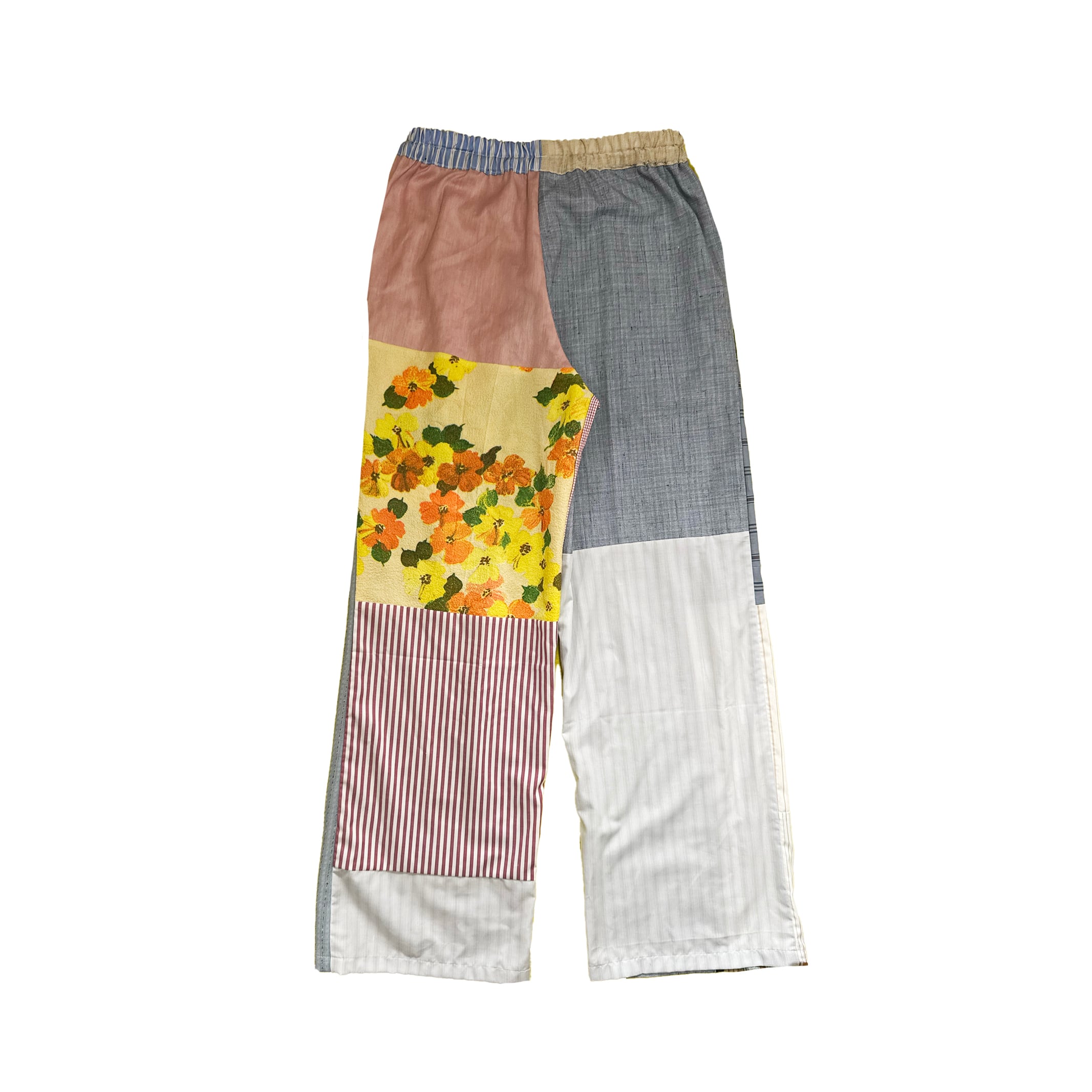 Patchwork of various vintage cotton fabrics, etc. Original silk screen print on pants.