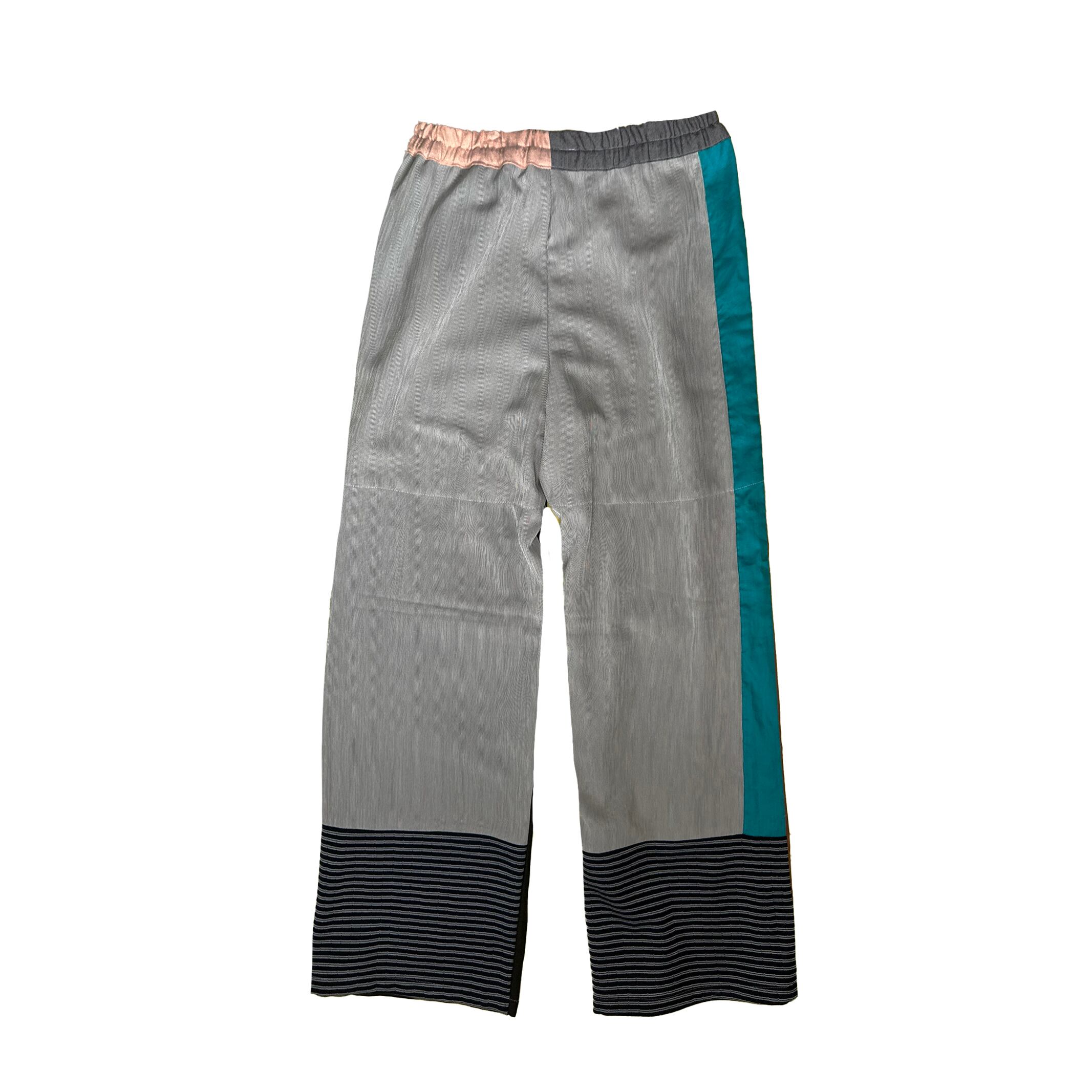 様々な中古の生地コットン、ポリエステル生地や古着のスーツ生地やなどを組み合わせて、上からオリジナルのシルクスクリーンプリントを施しています。