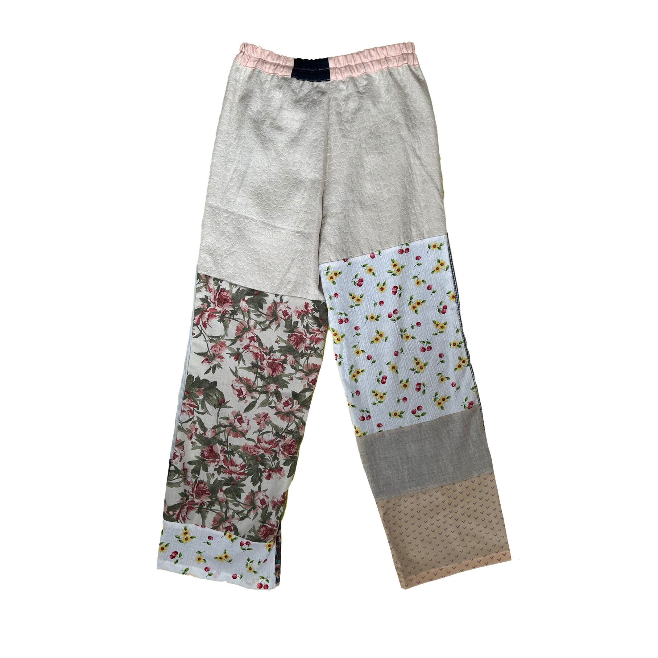 様々な中古の生地コットン、ポリエステル生地や古着のスーツ生地やなどを組み合わせて、上からオリジナルのシルクスクリーンプリントを施しています。