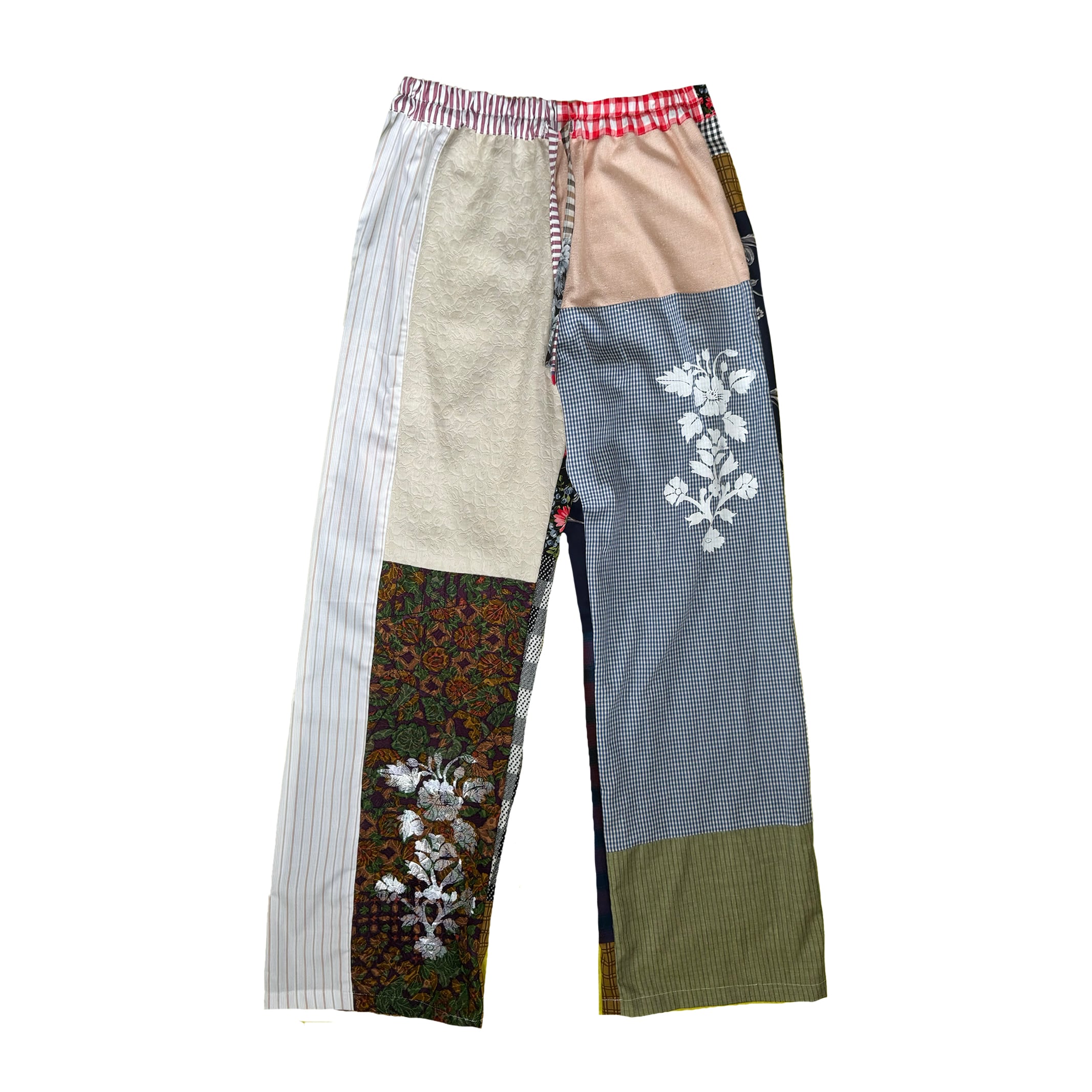 様々な中古の生地コットン、ポリエステル生地や古着のスーツ生地やなどを組み合わせて、上からオリジナルのシルクスクリーンプリントを施しています。
