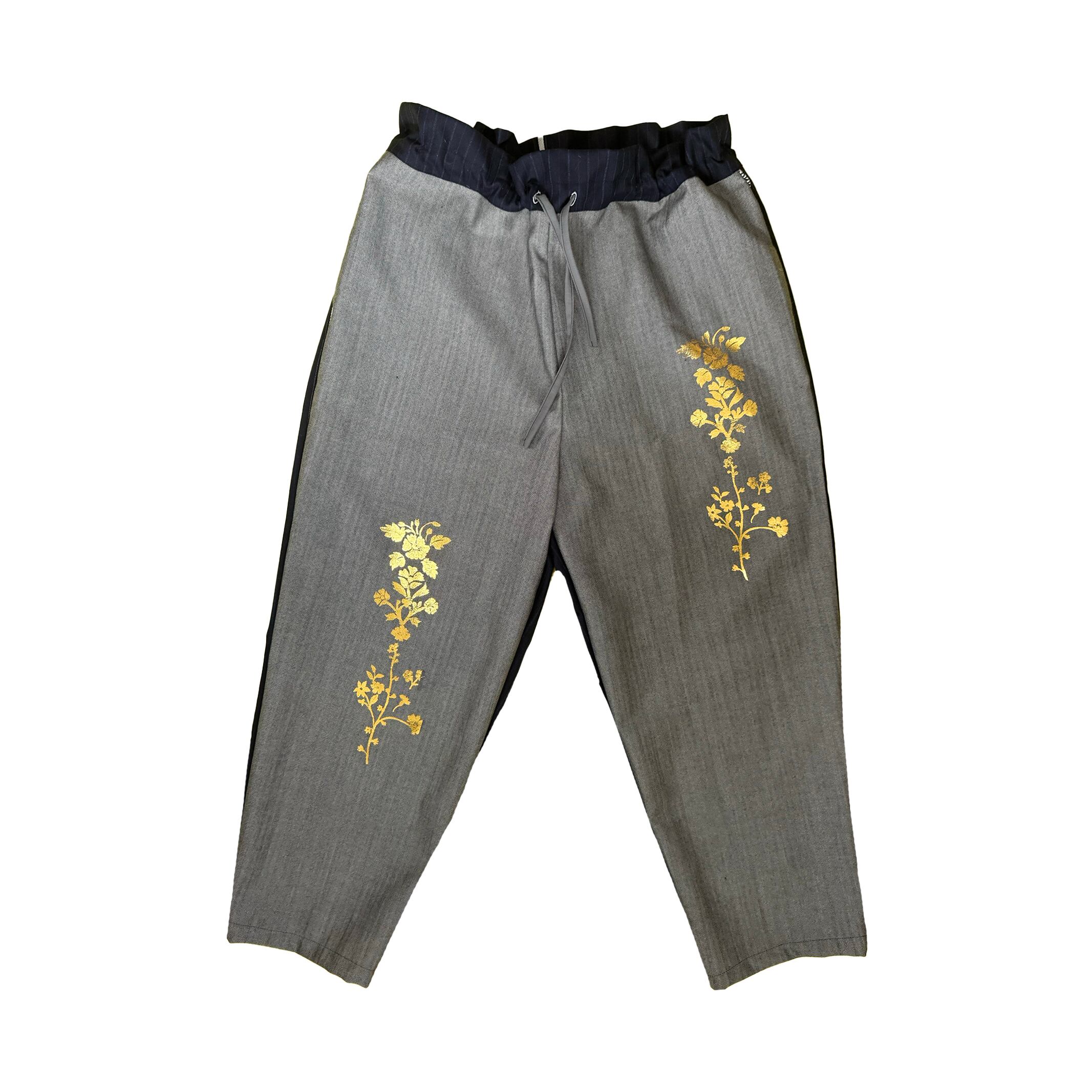 古着のスーツ生地などを組み合わせて、上からオリジナルの箔プリントを施しています。