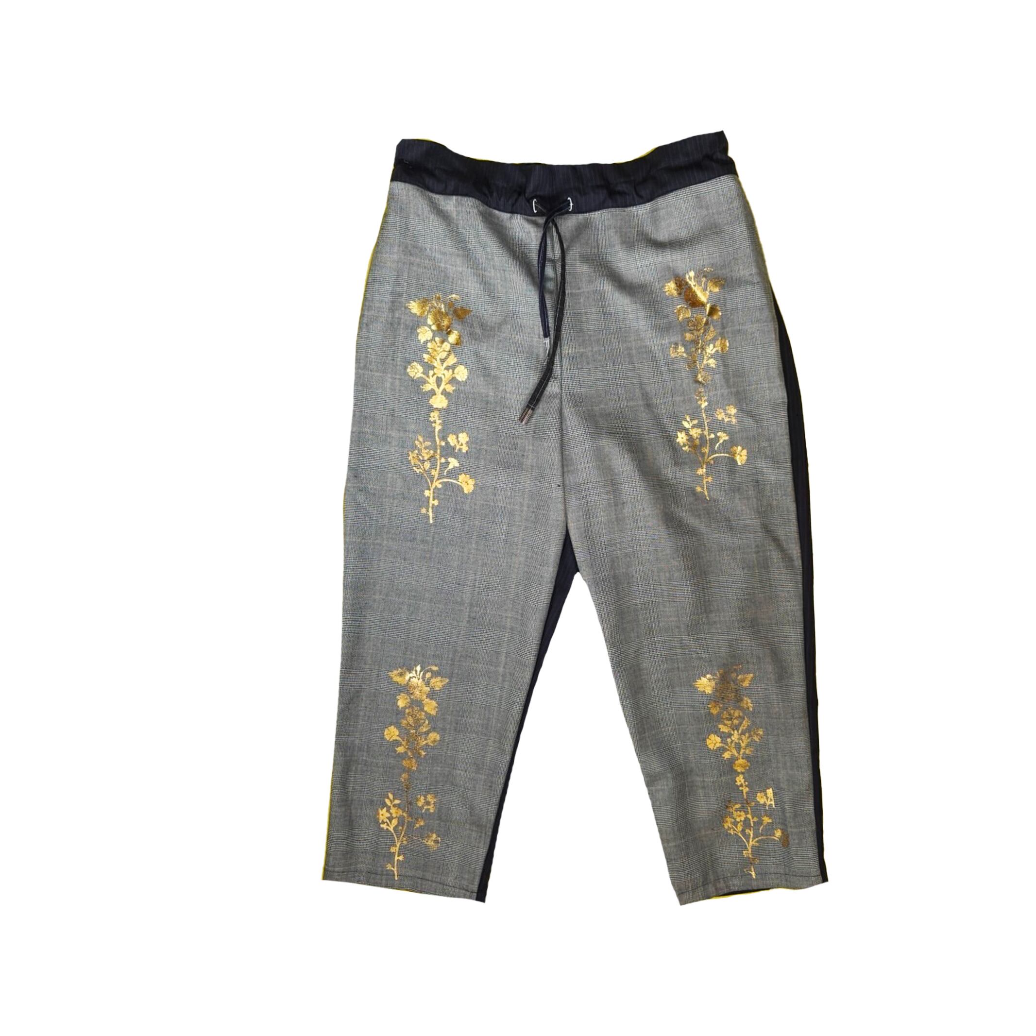 古着のスーツ生地などを組み合わせて、上からオリジナルの箔プリントを施しています。