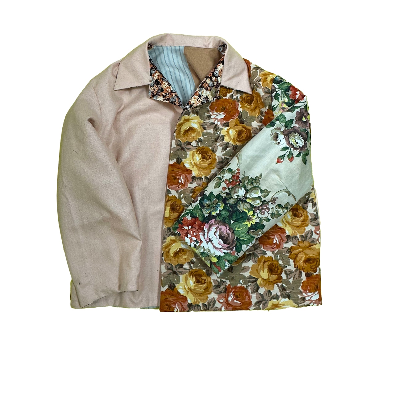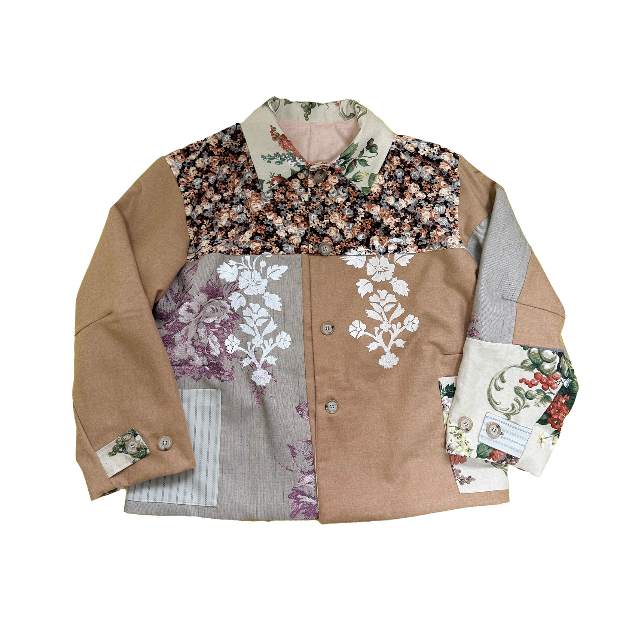 中古のスーツ生地やツィード生地やコットン生地を組み合わせ上からオリジナルのプリントを施した形はワークジャケットをもとに製作したジャケットです。裏もかわいいです。