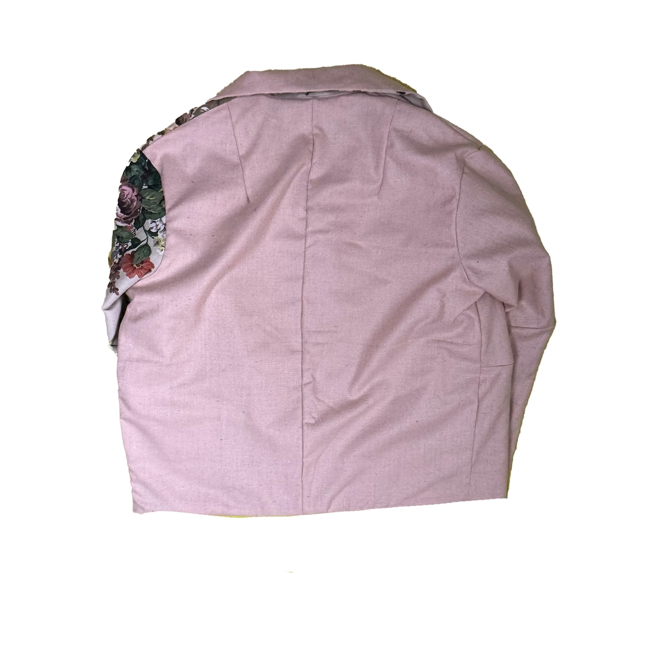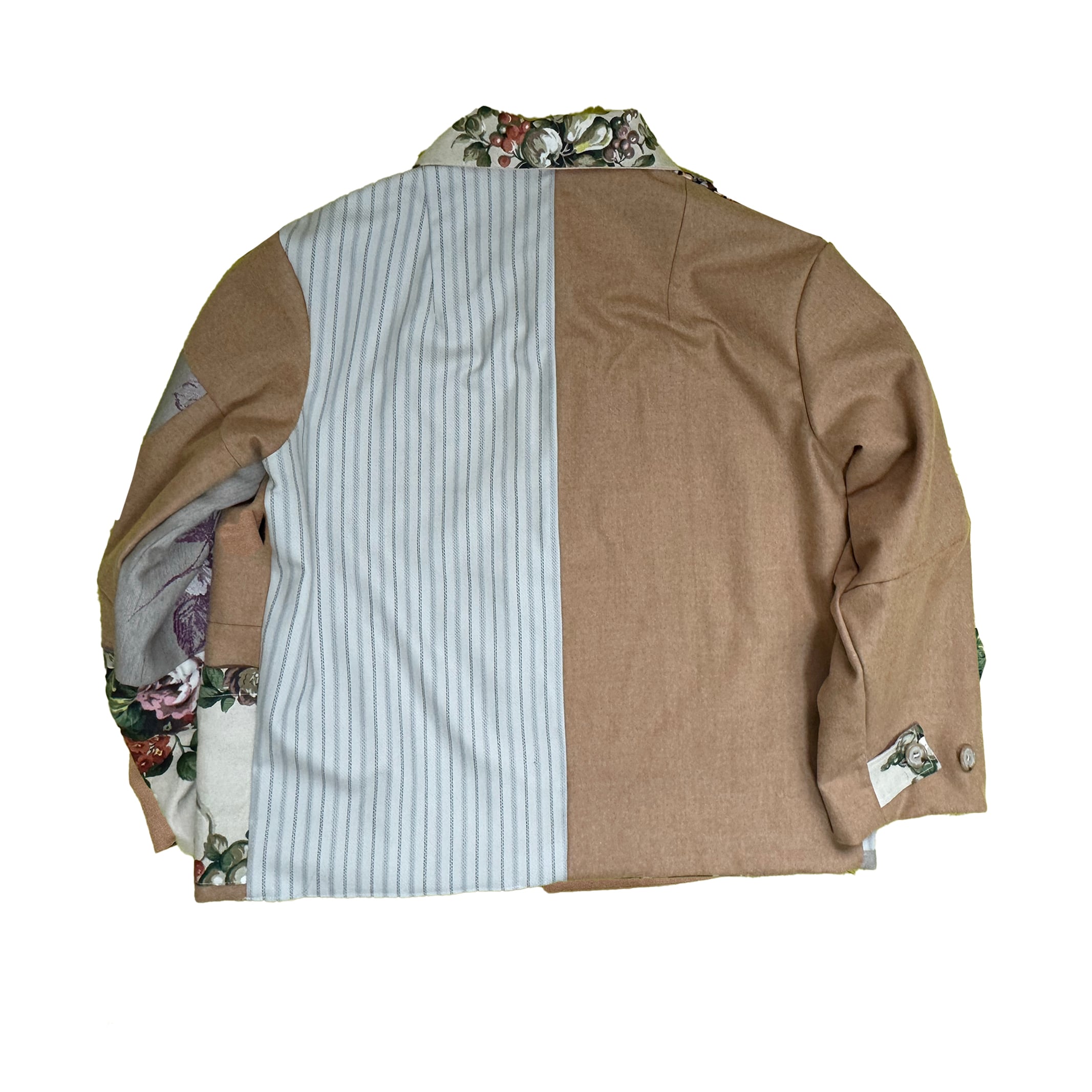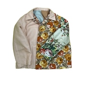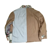 The shape of this jacket is based on a work jacket, combining used suit fabrics and cotton fabrics with original prints on the top. The back is also cute.