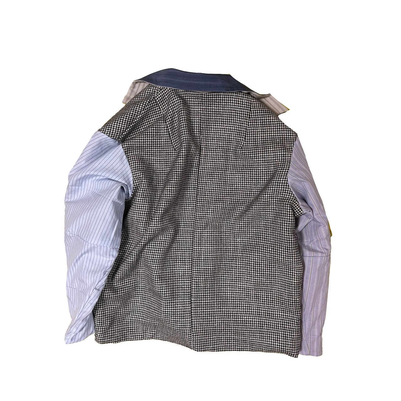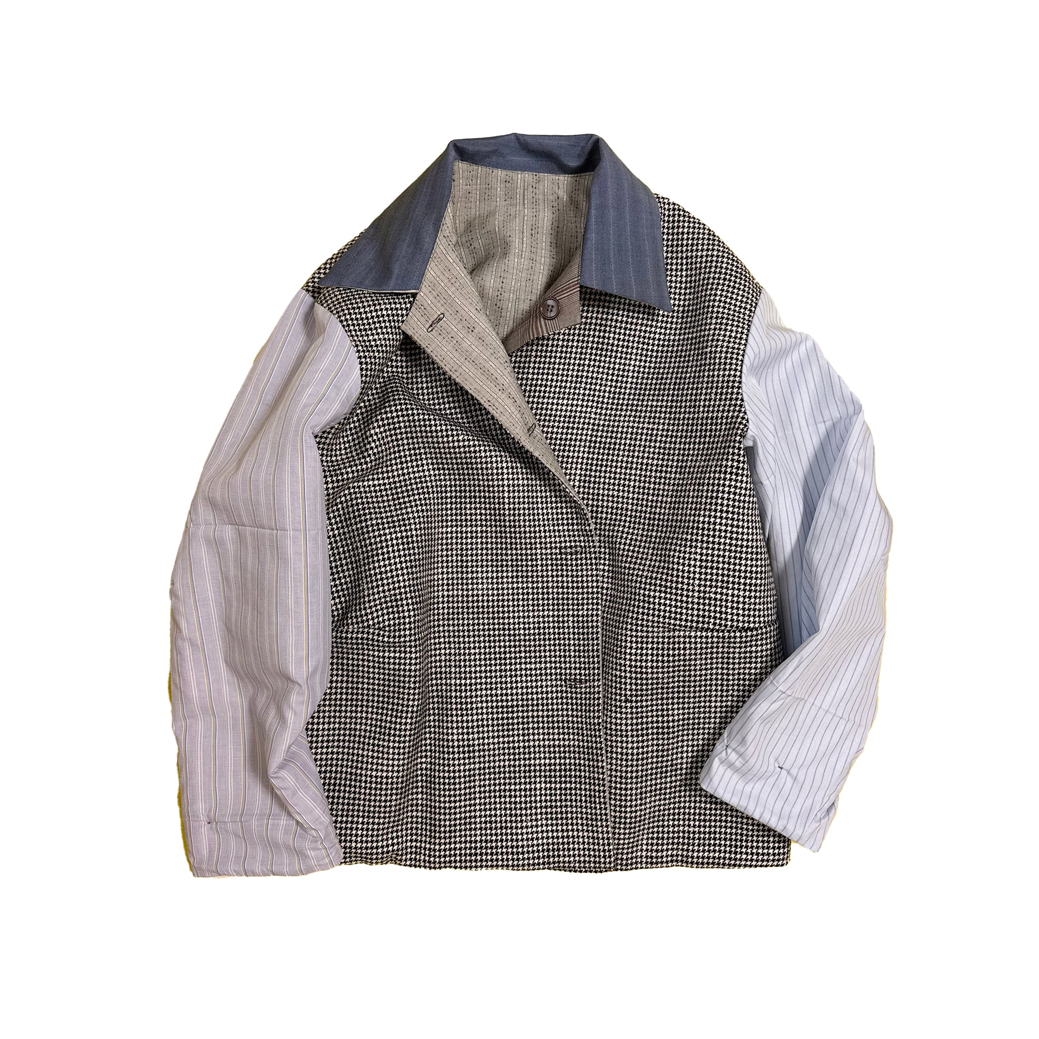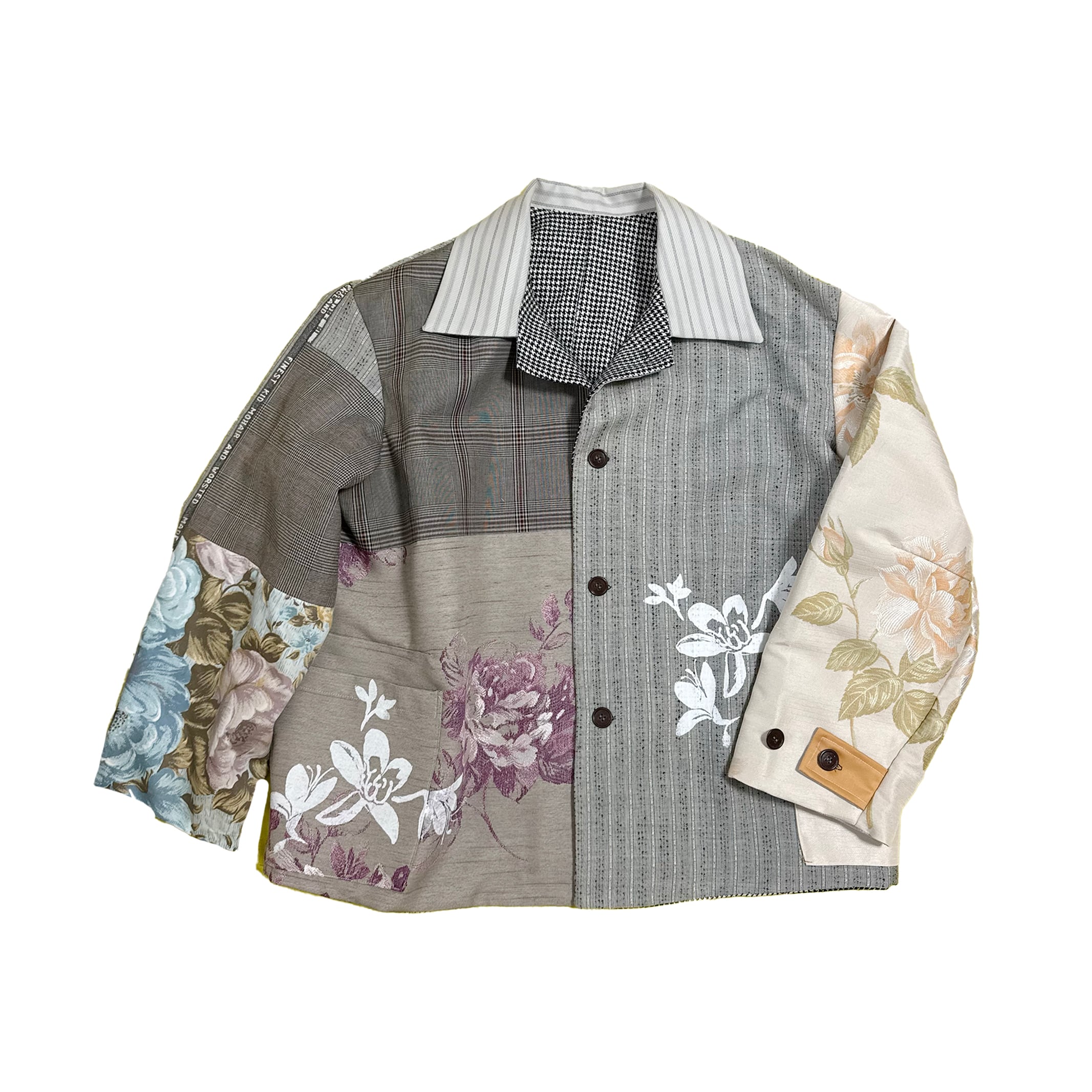 中古のスーツ生地やツィード生地やコットン生地やカーテン生地を組み合わせ上からオリジナルのプリントを施した形はワークジャケットをもとに製作したジャケットです。裏もかわいいです。