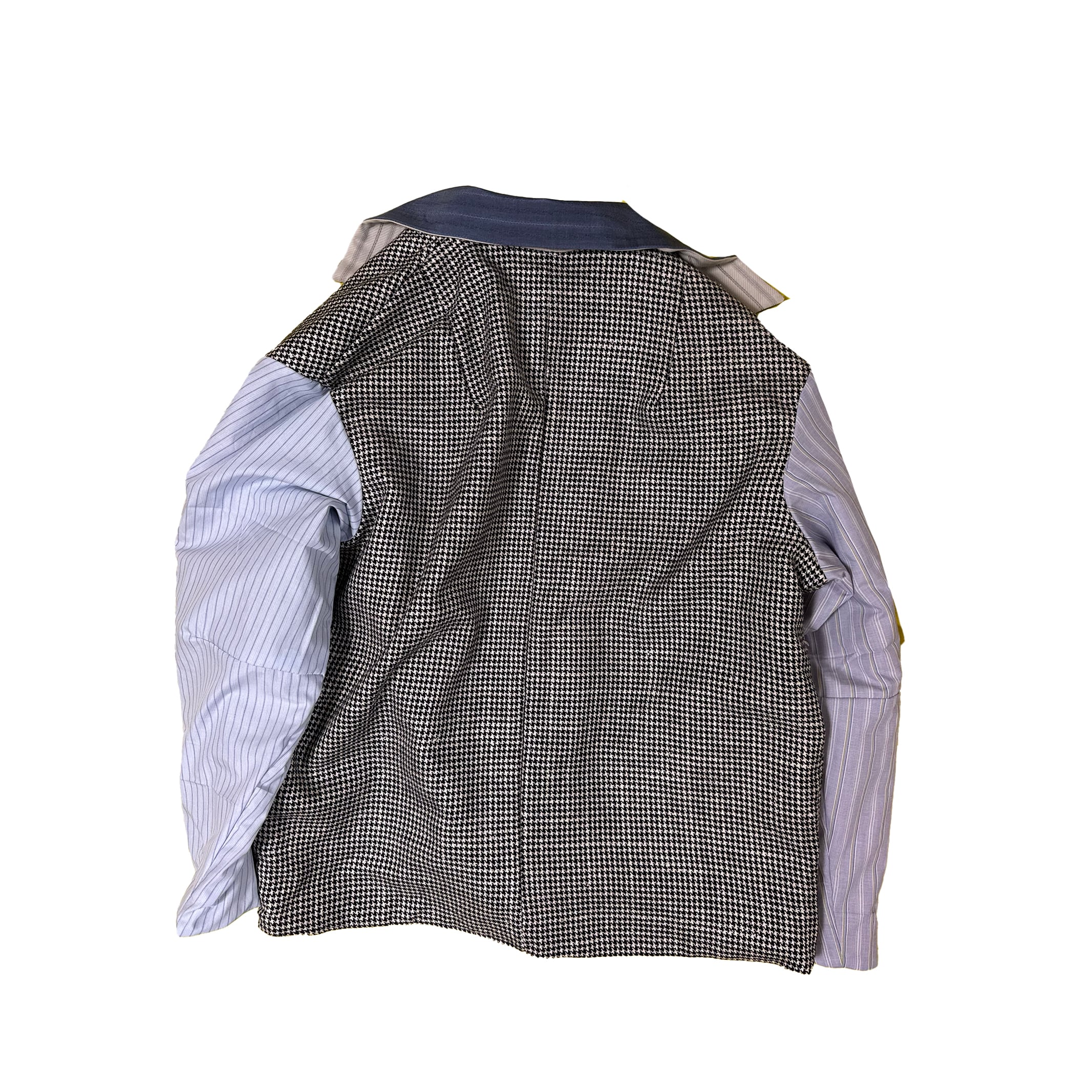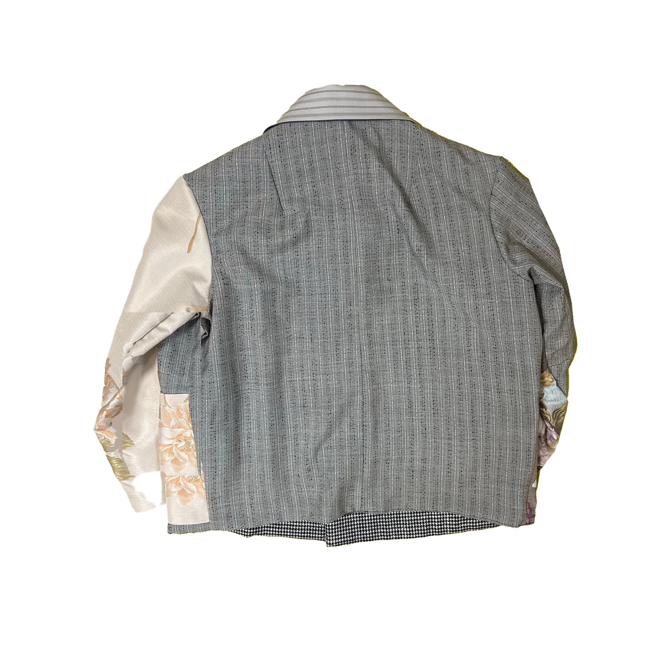 The shape of this jacket is based on a work jacket, combining used suit fabrics and cotton fabrics with original prints on the top. The back is also cute.