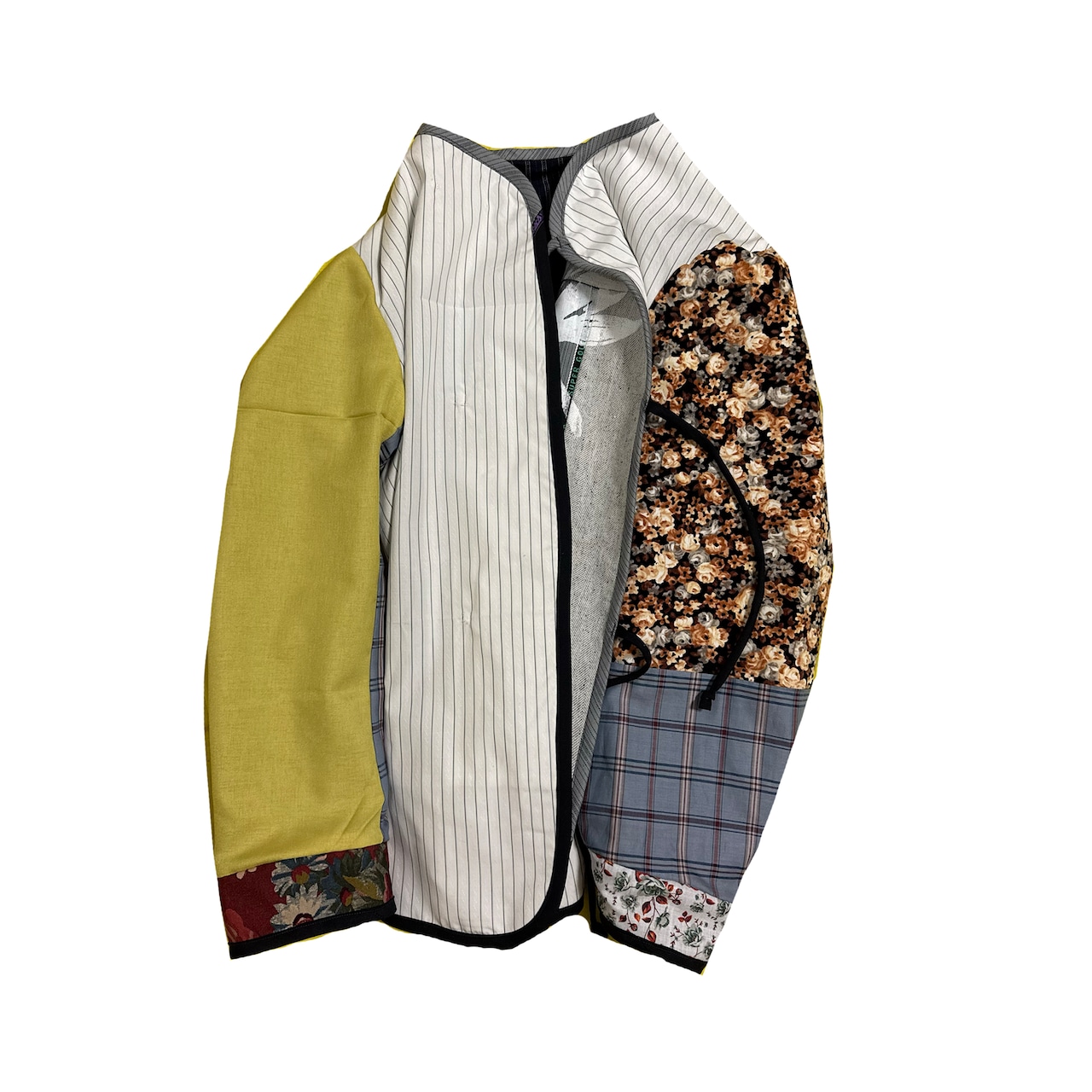 Reversible jacket combining various used fabrics. Very comfortable corduroy fabric and bold floral pattern fabrics are combined. The corduroy fabric has a little red stain around the chest area.