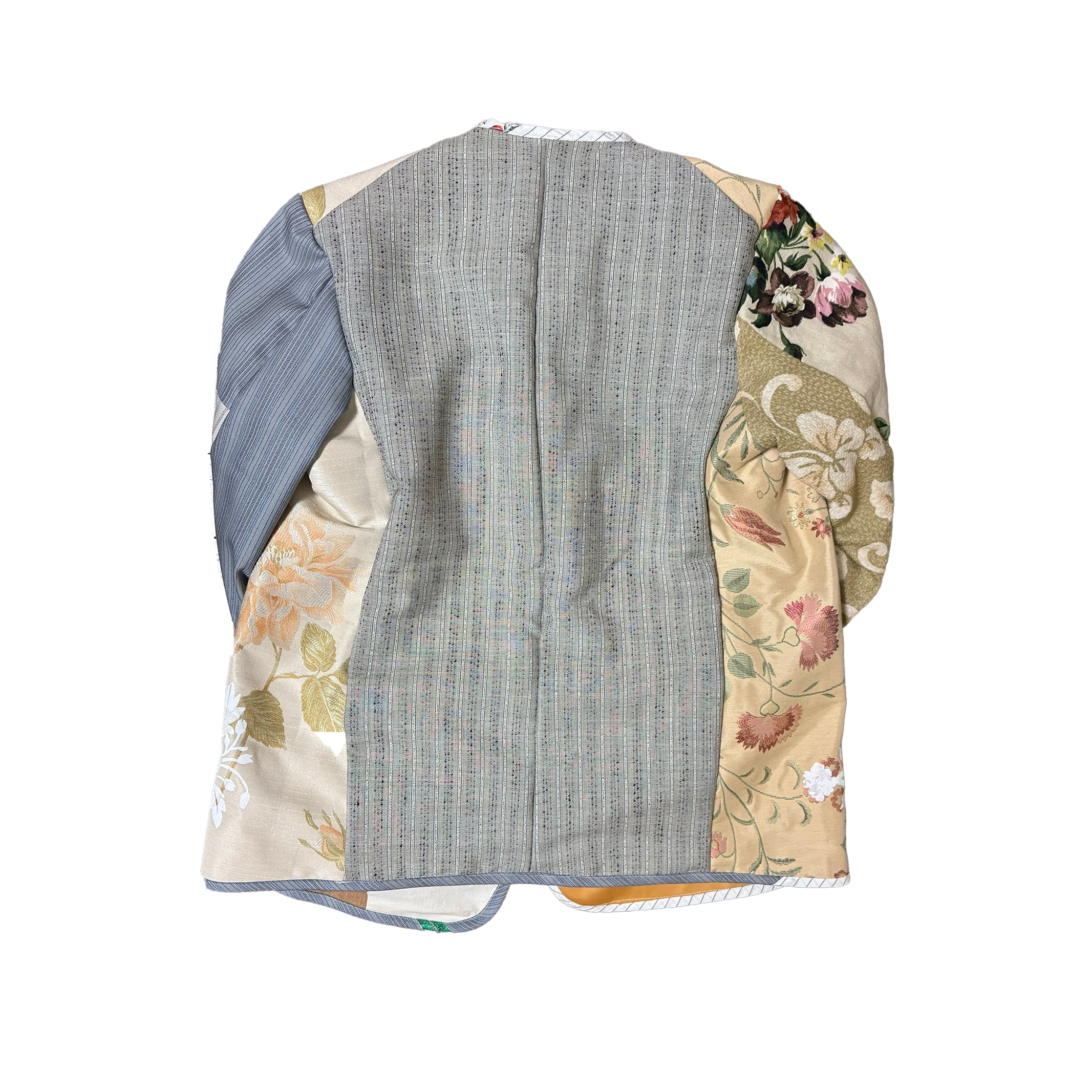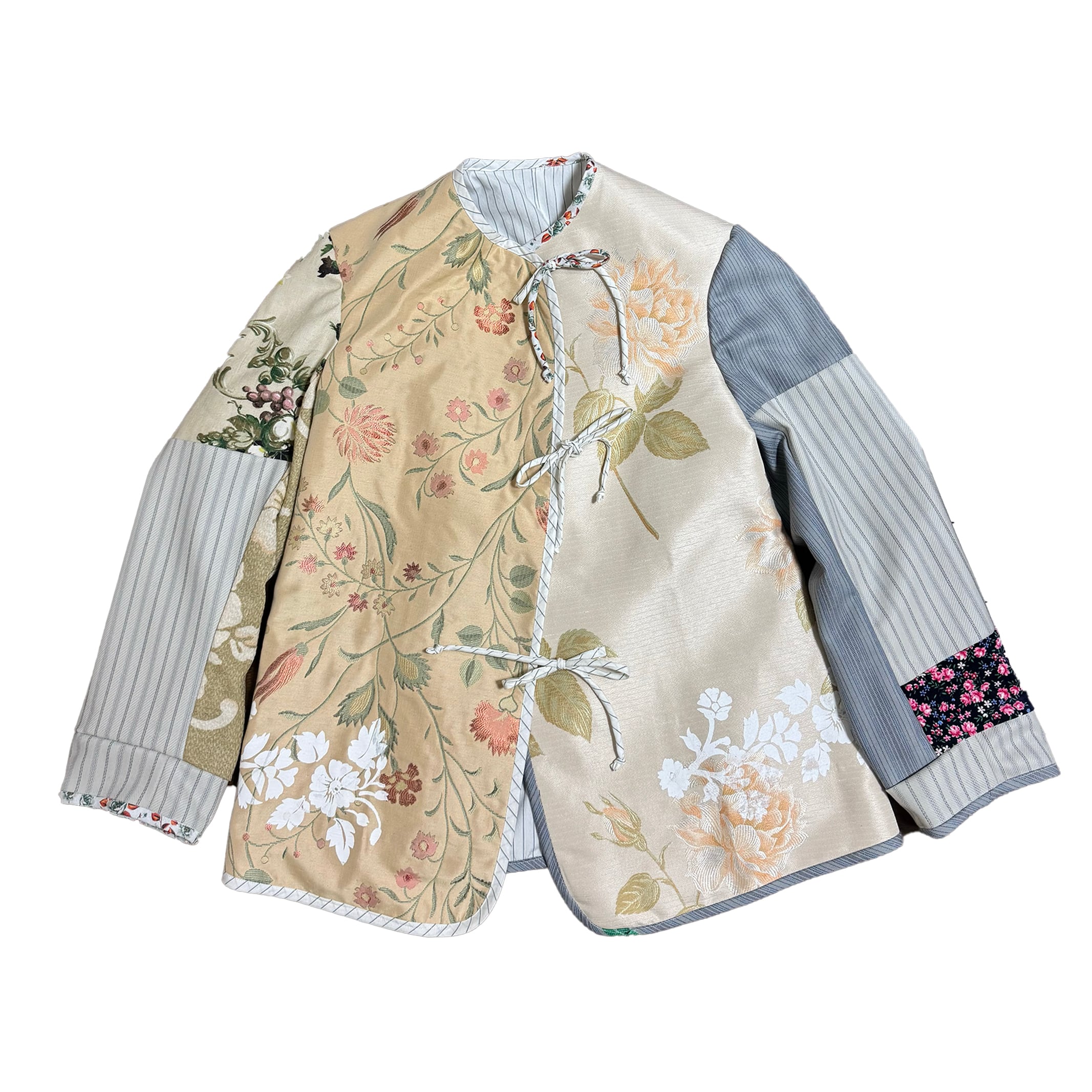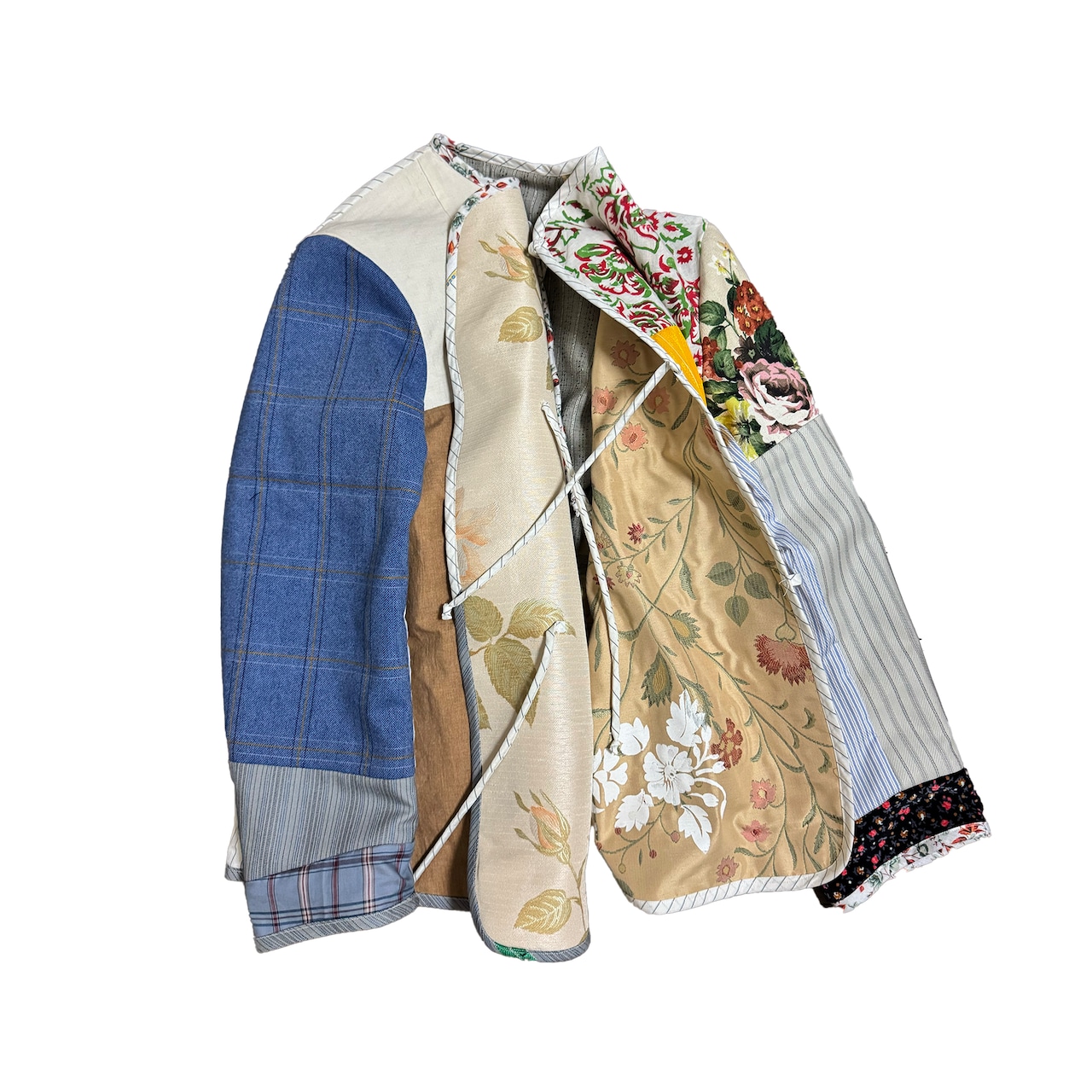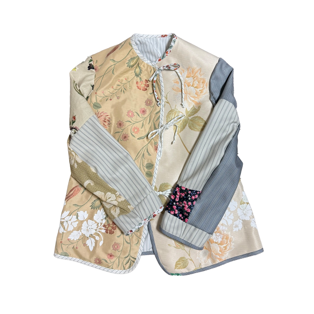Reversible jacket combining various used fabrics. Very comfortable corduroy fabric and bold floral pattern fabrics are combined. The corduroy fabric has a little red stain around the chest area.