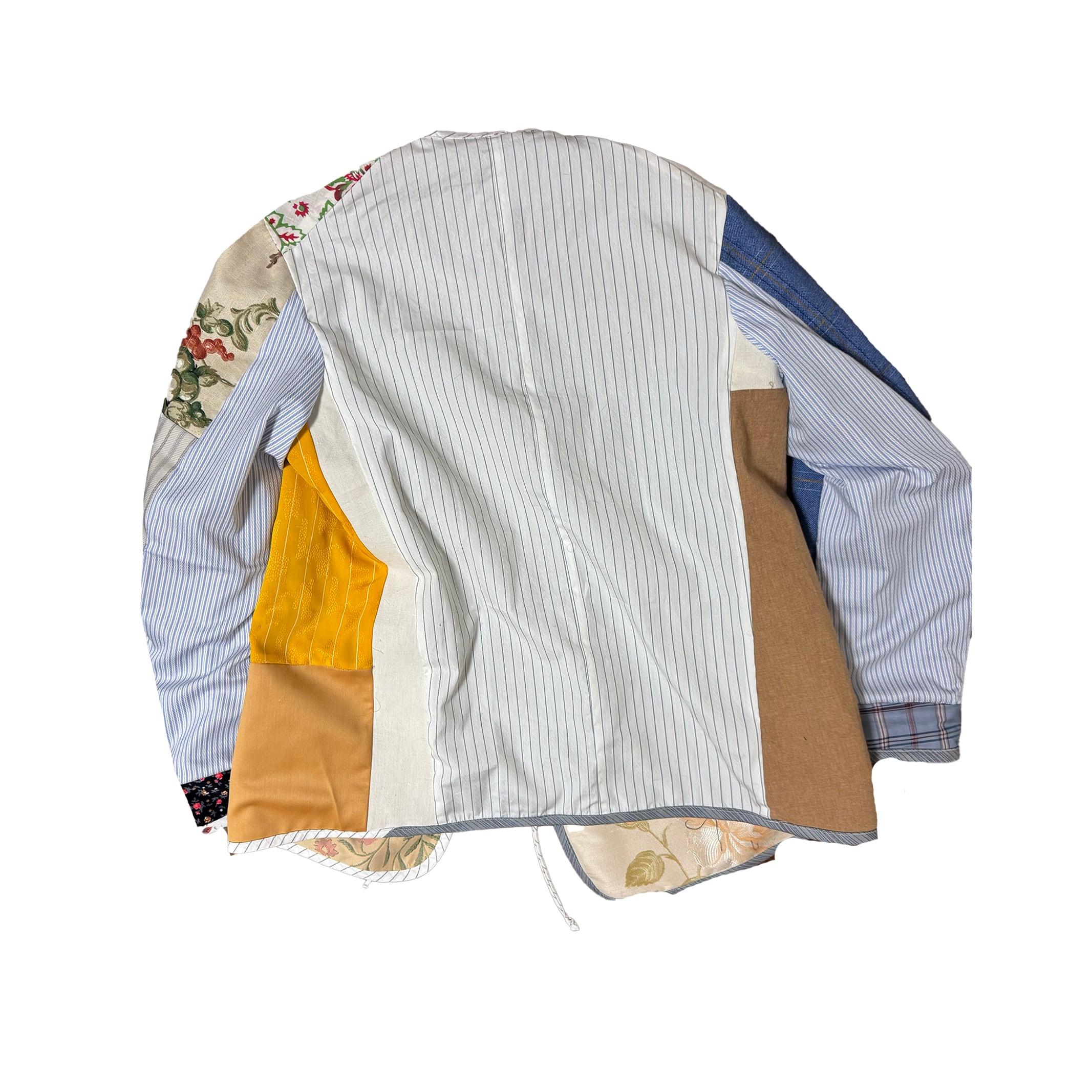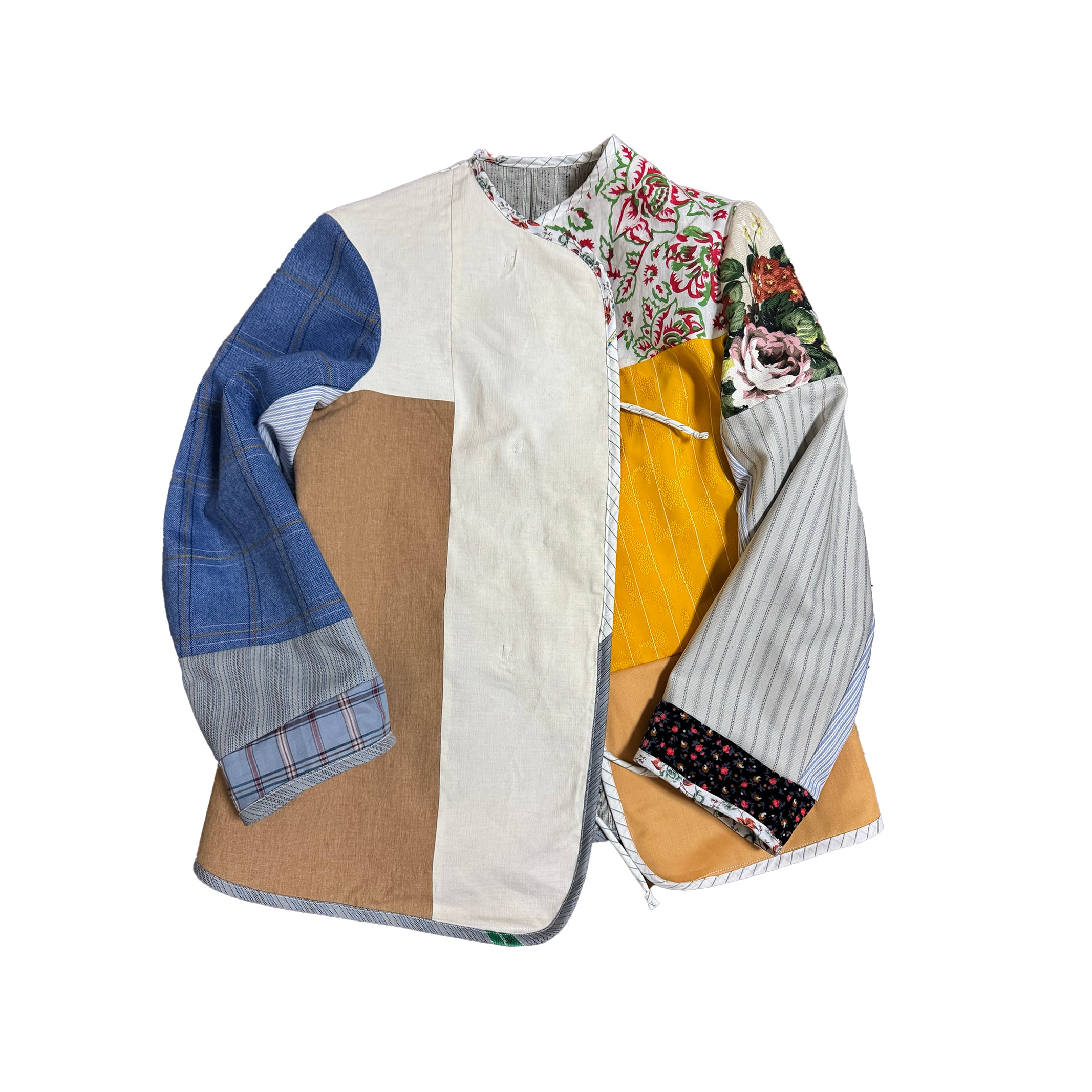 色々な中古の生地を組み合わせたリバーシブルジャケットです。上からオリジナルのシルクスクリーンプリントを施しました。