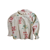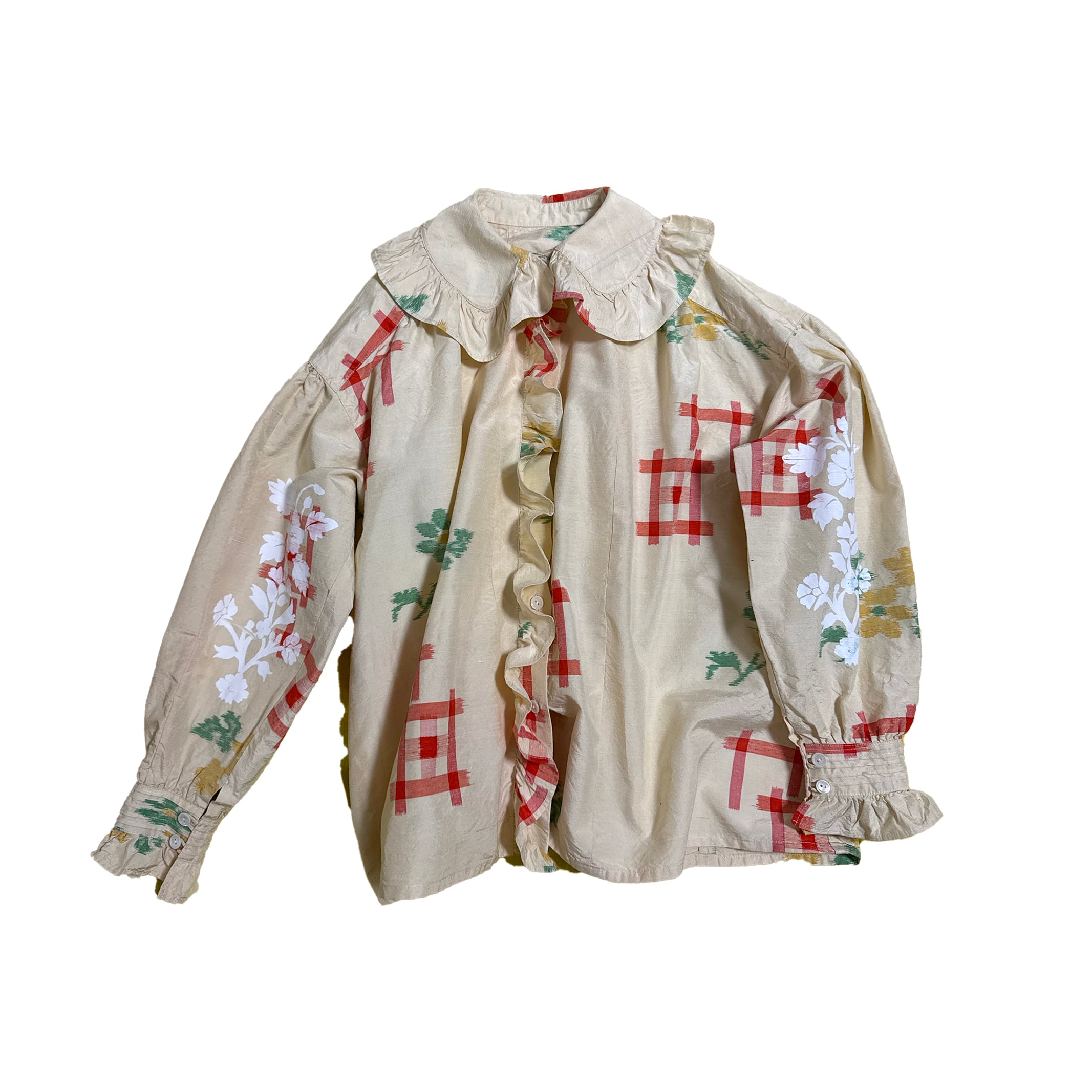 フランスのヴィンテージのブラウスを参考に作成したフリルブラウスです。使われなくなった着物のシルク生地を使用しています。上からオリジナルのシルクスクリーンプリントを施しています。