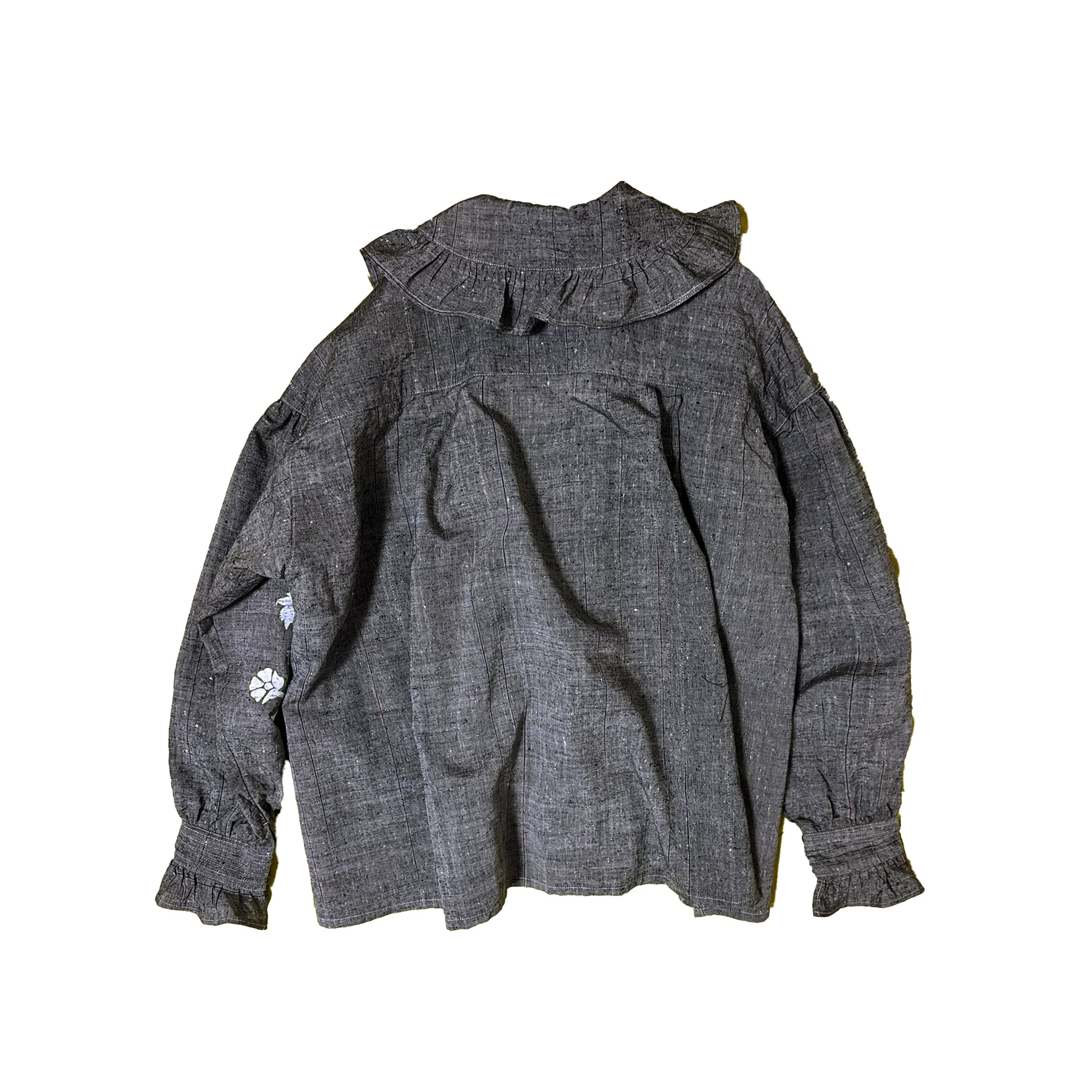 This ruffled blouse was designed with vintage French blouses in mind. It is made from silk fabric sourced from disused kimonos. An original silkscreen print has been applied to the fabric.