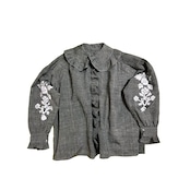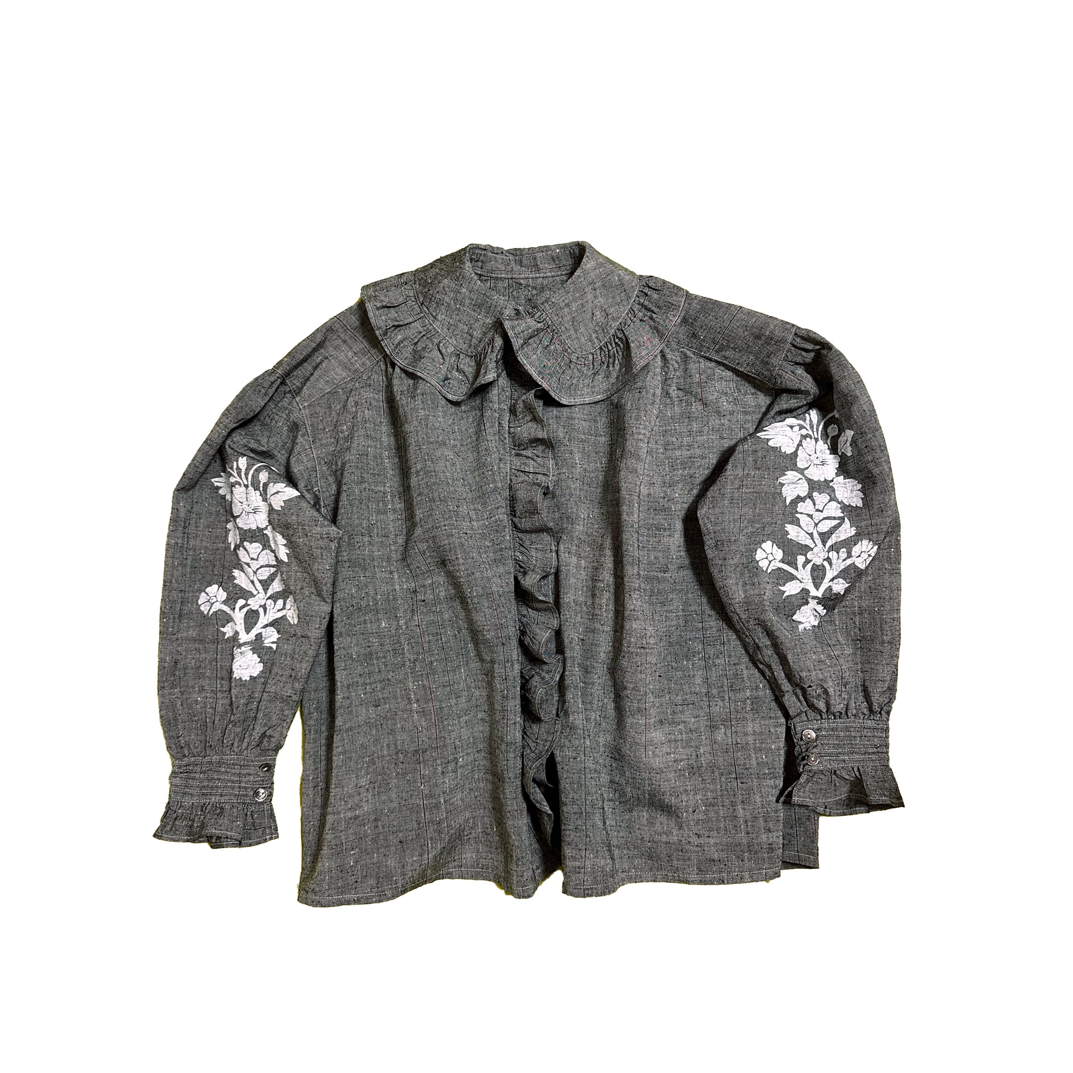フランスのヴィンテージのブラウスを参考に作成したフリルブラウスです。使われなくなった着物のシルク生地を使用しています。上からオリジナルのシルクスクリーンプリントを施しています。